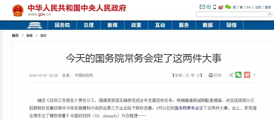 確定《政府工作報告》責任分工,強調(diào)狠抓落實確保完成全年發(fā)展目標任務;明確增值稅減稅配套措施,決定延續(xù)部分已到期稅收優(yōu)惠政策并對扶貧捐贈和污染防治第三方企業(yè)給予稅收優(yōu)惠。3月20日的國務院常務會定了這兩件大事。會上,李克強總理作出了哪些部署?中國政府網(wǎng)(ID:zhengfu)為你梳理──
