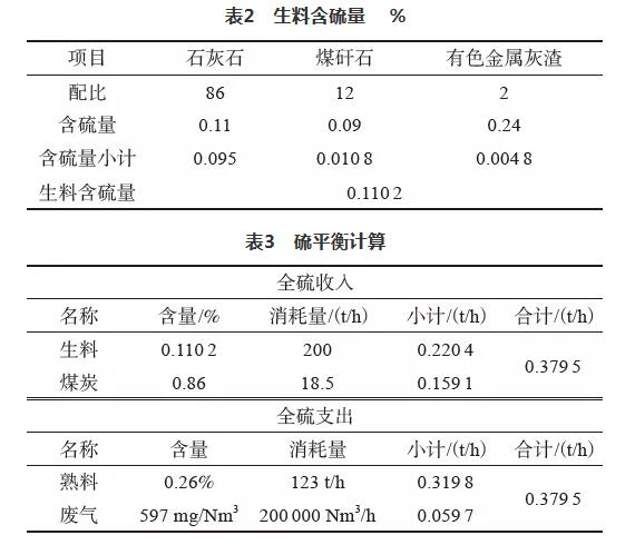 2)對窯爐系統(tǒng)料氣進行全硫的物料平衡,見表2、表3。