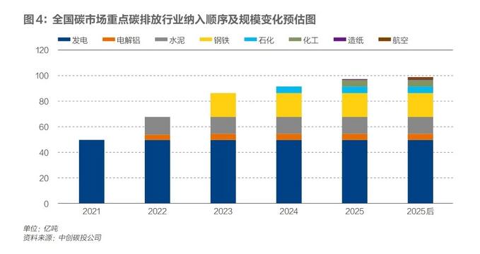 在碳市場(chǎng)涵蓋的范圍方面,未來以怎樣的節(jié)奏納入更多行業(yè),尚未明確。首個(gè)控排行業(yè)發(fā)電行業(yè)的碳排放總量約為40億噸,若電解鋁、水泥、鋼鐵、化工、造紙、石化、航空等七大高耗能行業(yè)全部納入全國(guó)碳市場(chǎng),碳排放總量預(yù)計(jì)在80億/年噸至100億噸/年之間。