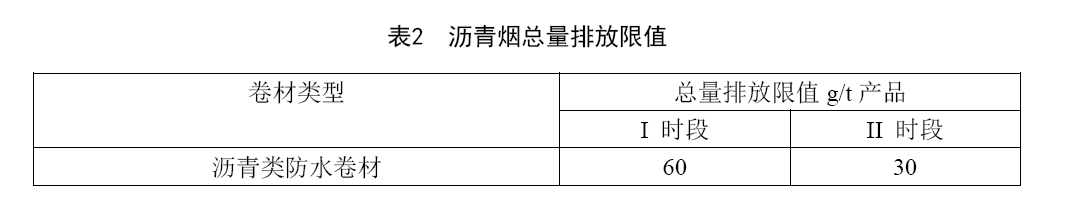 瀝青類防水卷材生產過程中,生產線以單位產品重量核算的瀝青煙排放總量執行表2規定。