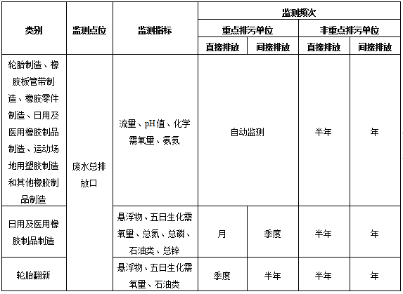 表1橡膠制品工業排污單位廢水排放監測點位、監測指標及最低監測頻次