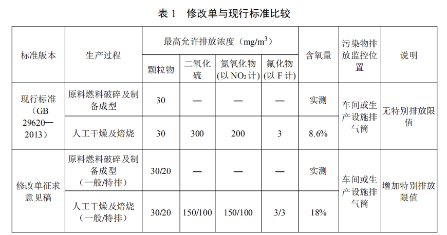 目前磚瓦行業(yè)執(zhí)行GB 29620—2013,梳理標(biāo)準存在的問題,對磚瓦窯煙氣 基準含氧量、重點地區(qū)特別排放限值等方面進行了修改,修改前后標(biāo)準變化情 況見表1。