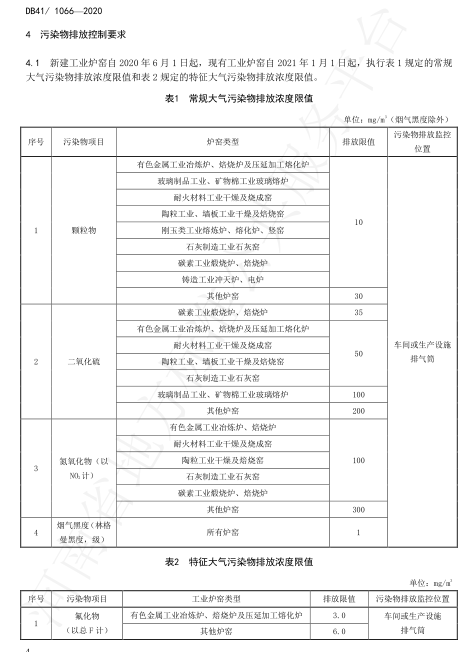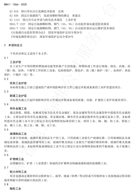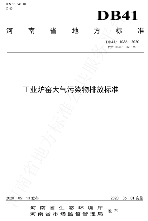 2020年4月10日,河南省市場監督管理局、河南省生態環境廳在鄭州主持召開了地方標準審查會,對河南2015年發布的(DB41/1066-2015)進行了修訂。2020年5月19日,河南省市場監督管理局以2020年29號公告批準發布了新修訂的《工業爐窯大氣污染物排放標準》(DB41/1066-2020),2020年6月1日起實施。