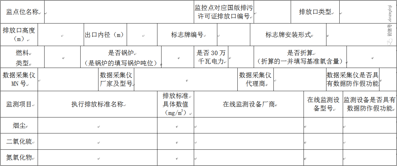 1、每個(gè)監(jiān)控點(diǎn)位填寫一張表,表中未涉及監(jiān)測(cè)因子企業(yè)可自行添加行。