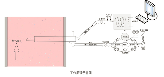 預處理模塊尾氣經采樣探頭重新返回煙道。所需射流氣、吹掃氣均由潔凈風機單元產生,吹掃氣 用于清潔煙塵儀的光學部件,確保系統長期可靠工作。