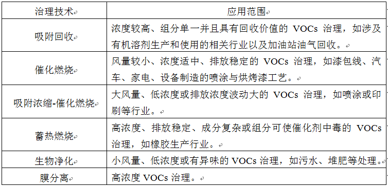 表5-1 常用VOCs治理技術及應用范圍