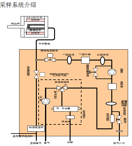 樣氣通過取樣探桿進(jìn)入到取樣探頭內(nèi),經(jīng)過陶瓷濾芯過濾后,除去樣氣中的