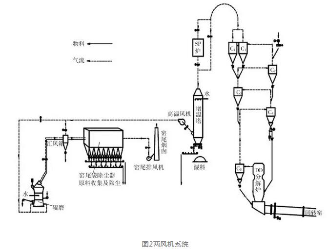 兩風(fēng)機(jī)系統(tǒng)是三風(fēng)機(jī)系統(tǒng)的簡(jiǎn)化,生料磨采用輥磨時(shí)非常合適,它簡(jiǎn)化了工藝,設(shè)備布局緊湊,投資低。但三風(fēng)機(jī)變?yōu)閮娠L(fēng)機(jī)系統(tǒng)后,系統(tǒng)設(shè)備負(fù)壓明顯提高,系統(tǒng)對(duì)設(shè)備漏風(fēng)更為敏感,需要更嚴(yán)格管理。兩風(fēng)機(jī)系統(tǒng)實(shí)際應(yīng)用偏少,但在我國(guó)以海螺集團(tuán)為代表的水泥生產(chǎn)線上卻有大量應(yīng)用。實(shí)踐表明,生產(chǎn)管理得好時(shí),兩風(fēng)機(jī)系統(tǒng)會(huì)比三風(fēng)機(jī)系統(tǒng)節(jié)能。