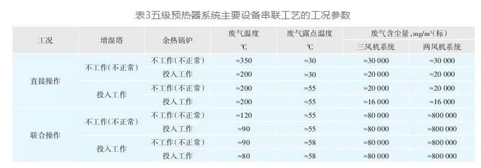 水泥窯尾廢氣處理系統(tǒng)都是按含生料磨烘干聯(lián)合操作廢氣考慮的,特點(diǎn)是工況參數(shù)常變,以典型的五級(jí)預(yù)熱器系統(tǒng)主設(shè)備串聯(lián)工藝為例,即圖1、2示意的工藝,至少可以產(chǎn)生如表3的工況參數(shù)。