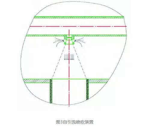 2001年,我們開始研究行噴脈沖清灰長(zhǎng)袋袋收塵器。除塵器的新結(jié)構(gòu)采用自引流脈沖噴吹裝置(非文氏管)(圖3)和長(zhǎng)袋分排清灰,將袋長(zhǎng)由3m加長(zhǎng)到6m以上,基本解決了袋長(zhǎng)限制。