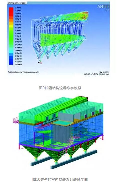 實(shí)際上,該綜合平臺(tái)是我們?cè)谏a(chǎn)過(guò)程中分段研發(fā)的。首先通過(guò)數(shù)字流場(chǎng)計(jì)算的模擬,確定了公司標(biāo)準(zhǔn)袋除塵器系列及多種非標(biāo)改造的低阻結(jié)構(gòu)(圖9、10)。