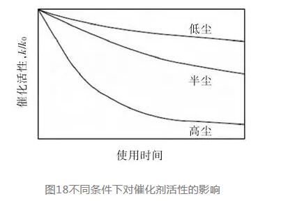 國(guó)外有關(guān)研究實(shí)驗(yàn)結(jié)果給出了催化劑活性使用壽命與氣體含塵量的關(guān)系(見圖18)。由此可見,氣體含塵量高會(huì)大大縮短水泥SCR脫硝催化劑的使用壽命,水泥窯尾的高塵布置方案會(huì)更糟。