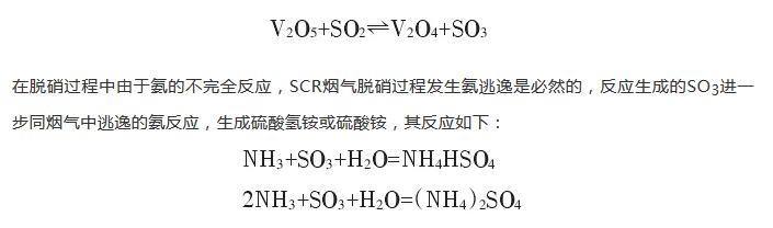 由于煙氣中存在SO2等氣體,催化劑中的活性成分釩盡管是選擇催化降解NOx的,但也會(huì)對(duì)SO2的氧化起到一定的催化作用,SO2的氧化率隨活性組分V2O5含量的增加而上升,其反應(yīng)式如下: