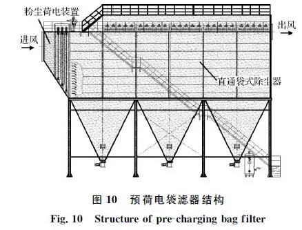 針對轉爐二次煙氣的排放特征,中鋼集團天澄環??萍脊煞萦邢薰鹃_發了預荷電袋濾器除塵技術,將預荷電和直通式袋式除塵器復合形成一體化裝置,如圖10所示。粉塵預荷電后在濾袋表面將形成海綿狀粉餅結構,能提高凈化效率,同時降低運行阻力。中鋼天澄在鞍鋼煉鋼總廠2×180t轉爐二次煙氣凈化項目中建成示范工程,處理風量2×60萬m3/h。2014年12月正式投運,截止目前持續穩定,運行可靠,顆粒物排放質量濃度低于10mg/m3,技術性能指標達到超低排放,運行阻力為700~1 000Pa,低于傳統袋式除塵器。目前,在日照鋼鐵、新余鋼鐵、正大特鋼、唐鋼青龍、柳鋼等得到推廣應用。