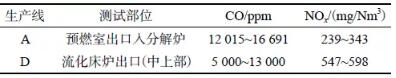 煤粉在預燃室或流化床爐中燃燒,測試出口的CO濃度一度超過10 000 ppm,說明煤粉發生不完全燃燒,而不完全燃燒的焦炭和CO能夠有效抑制和還原NOx;同時預燃室或流化床爐出口的NOx濃度均不高于600 mg/Nm3,與旋流噴騰爐中部煙氣成分相比較低。預燃室或流化床爐產生的煙氣連同未燃盡的煤粉(大量不完全燃燒),通過煙氣連接管道送入窯尾煙室之上的分解爐內,與窯的煙氣匯合,在上升過程中對NOx有持續的還原作用。因此單從NOx減排角度來看,旁置預燃室爐和流化床爐型均有利于還原窯尾煙氣中的NOx。